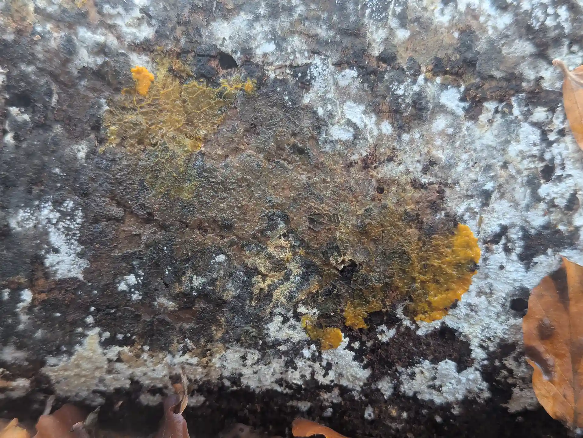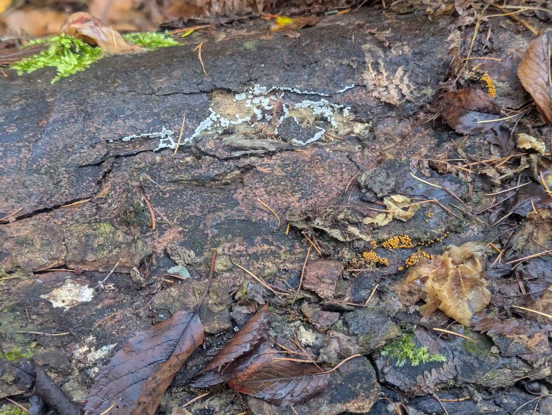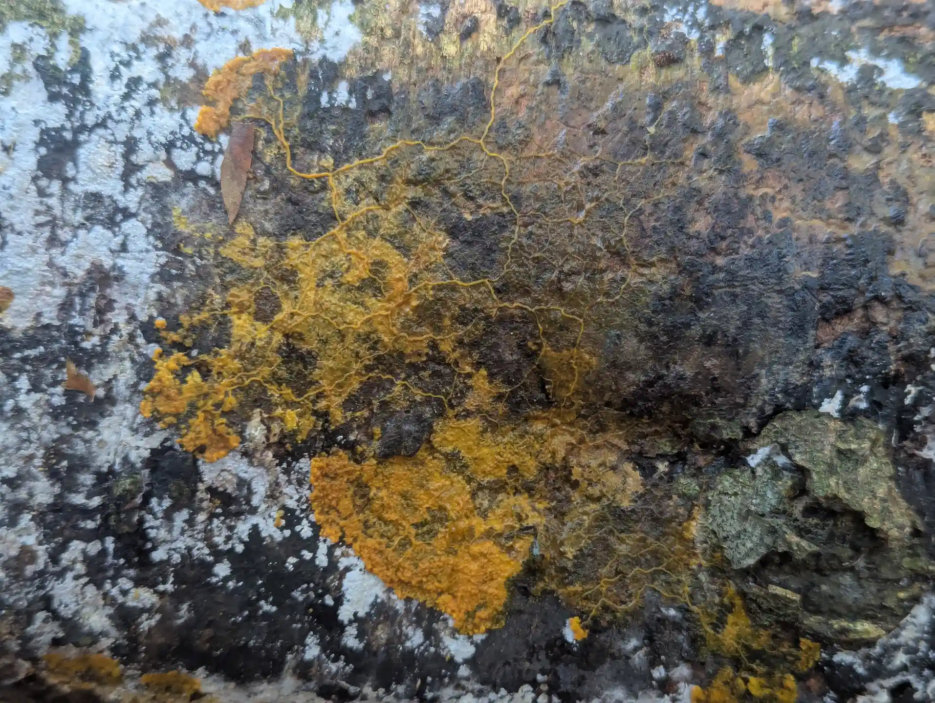On a fallen branch – an unidentified sprawling slime mould phaneroplasmodium advancing in multiple directions. This was a super exciting find, as it seems uncommon to spot them.