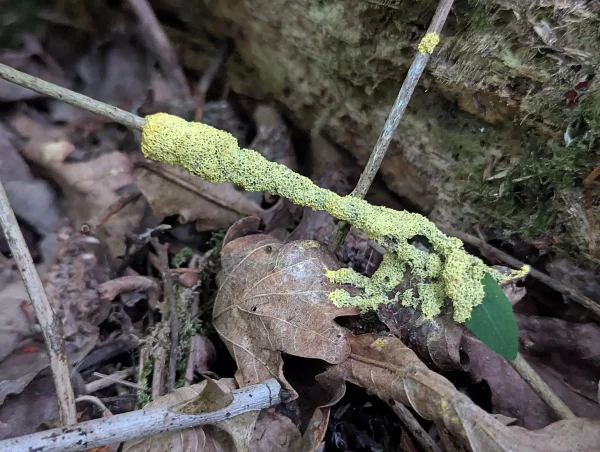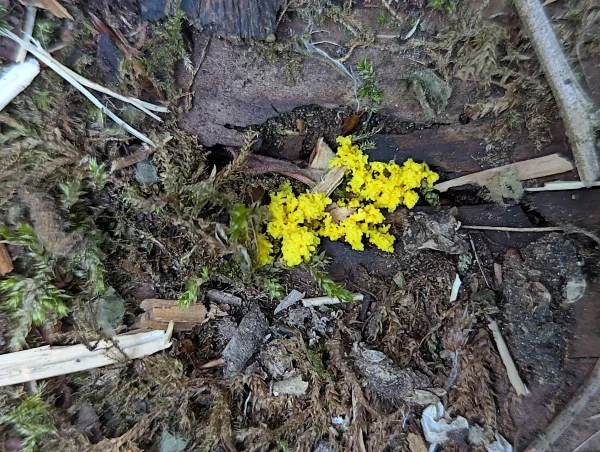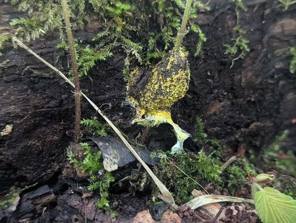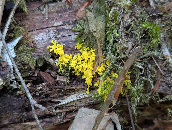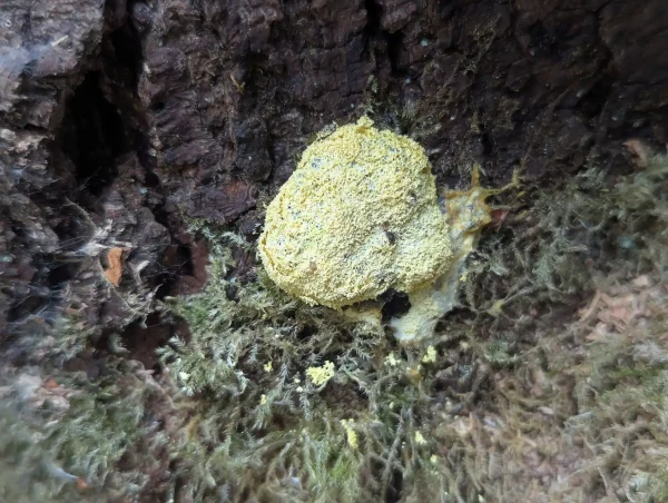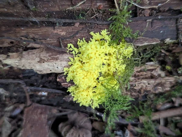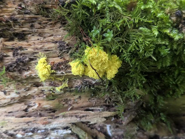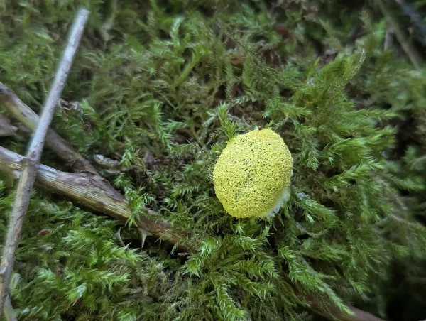 At the Basecamp loop we spotted two linear aethalia that had coalesced around two twigs – notice the discrete blobby plasmodial fragments on the moss to the left of the longer aethalium.