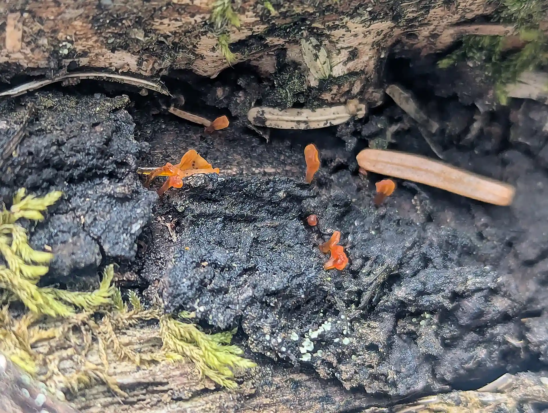 On the way back to Hawkeshead, at Furness Fells, I stopped by a log stack for a rest. In cup at the cut end of a log, growing out of a thin detritus layer, were some small, translucent orange-red fan shaped fungi.