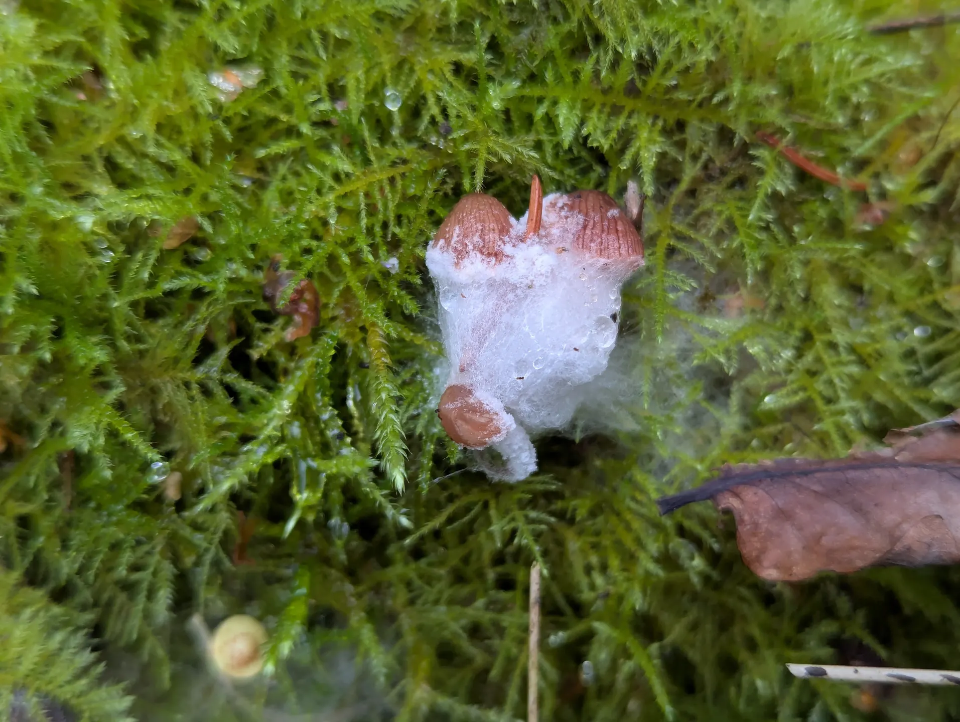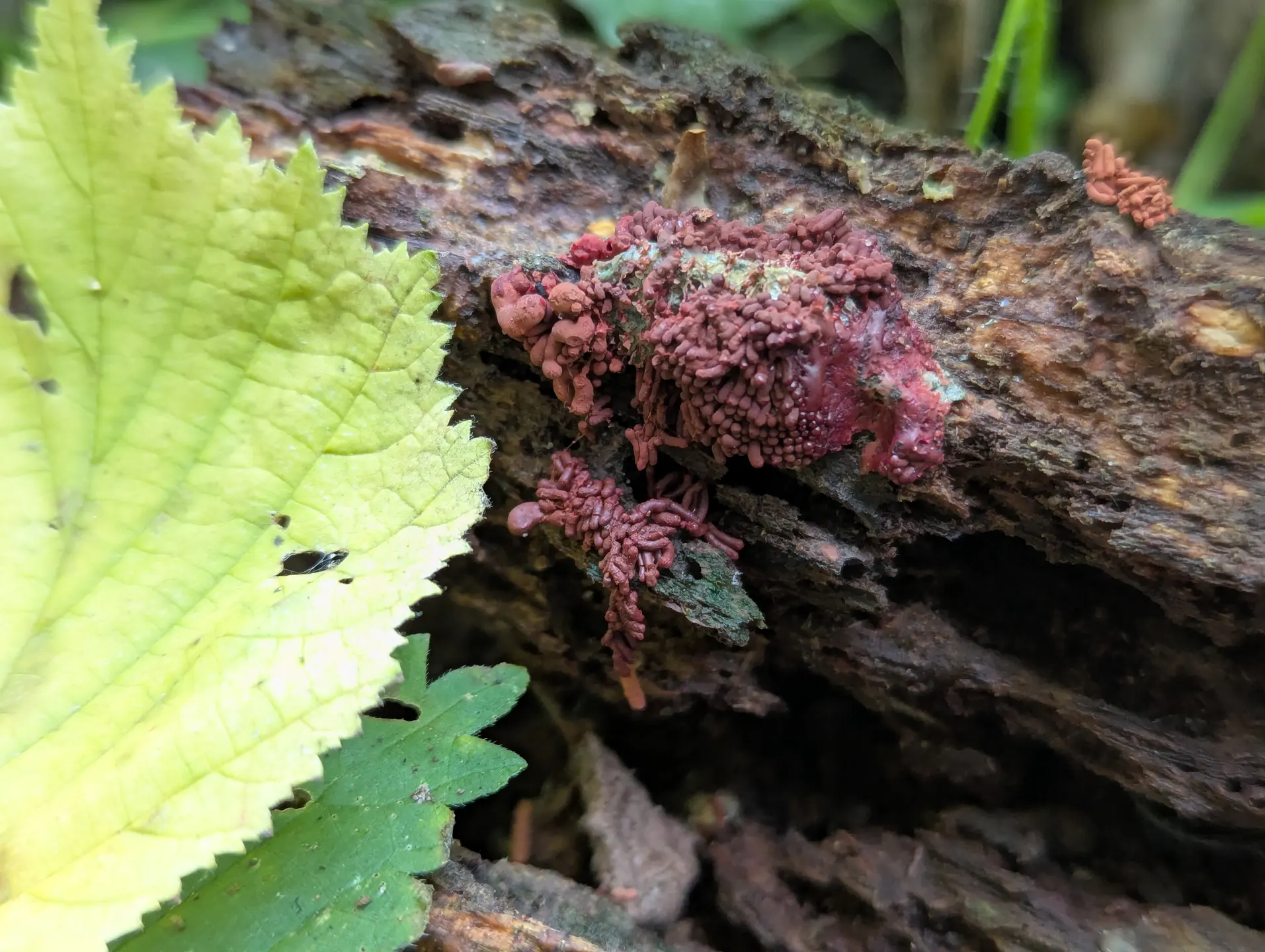 Thinking about it, these moist, pinkish buff sporangia do have a similar form to the Heterotrichia obvelata that we found earlier in 2025, although back then we did not observe the slime mould between its white primordial forms and the mature pale-beige, matte sporangial forms.