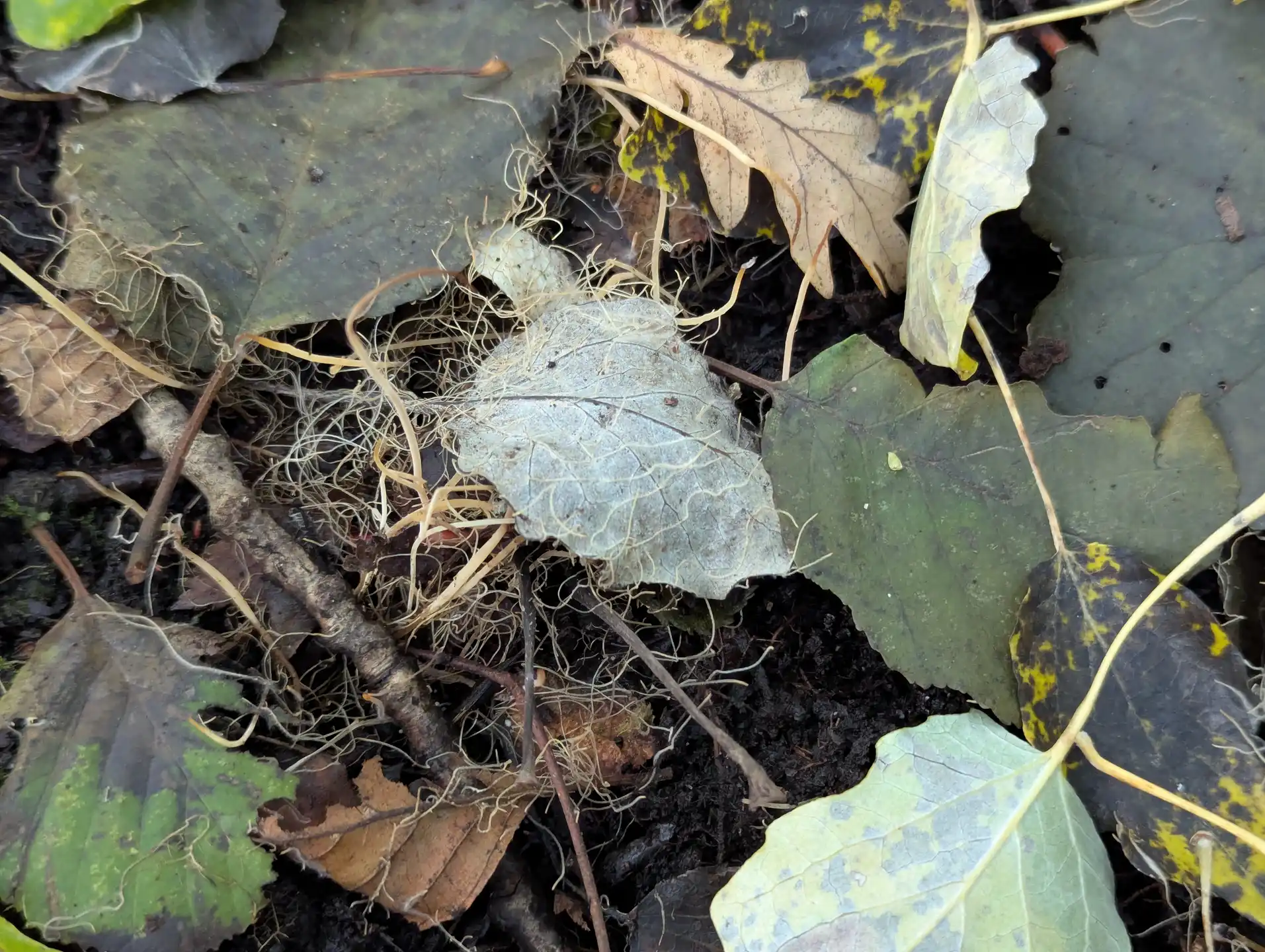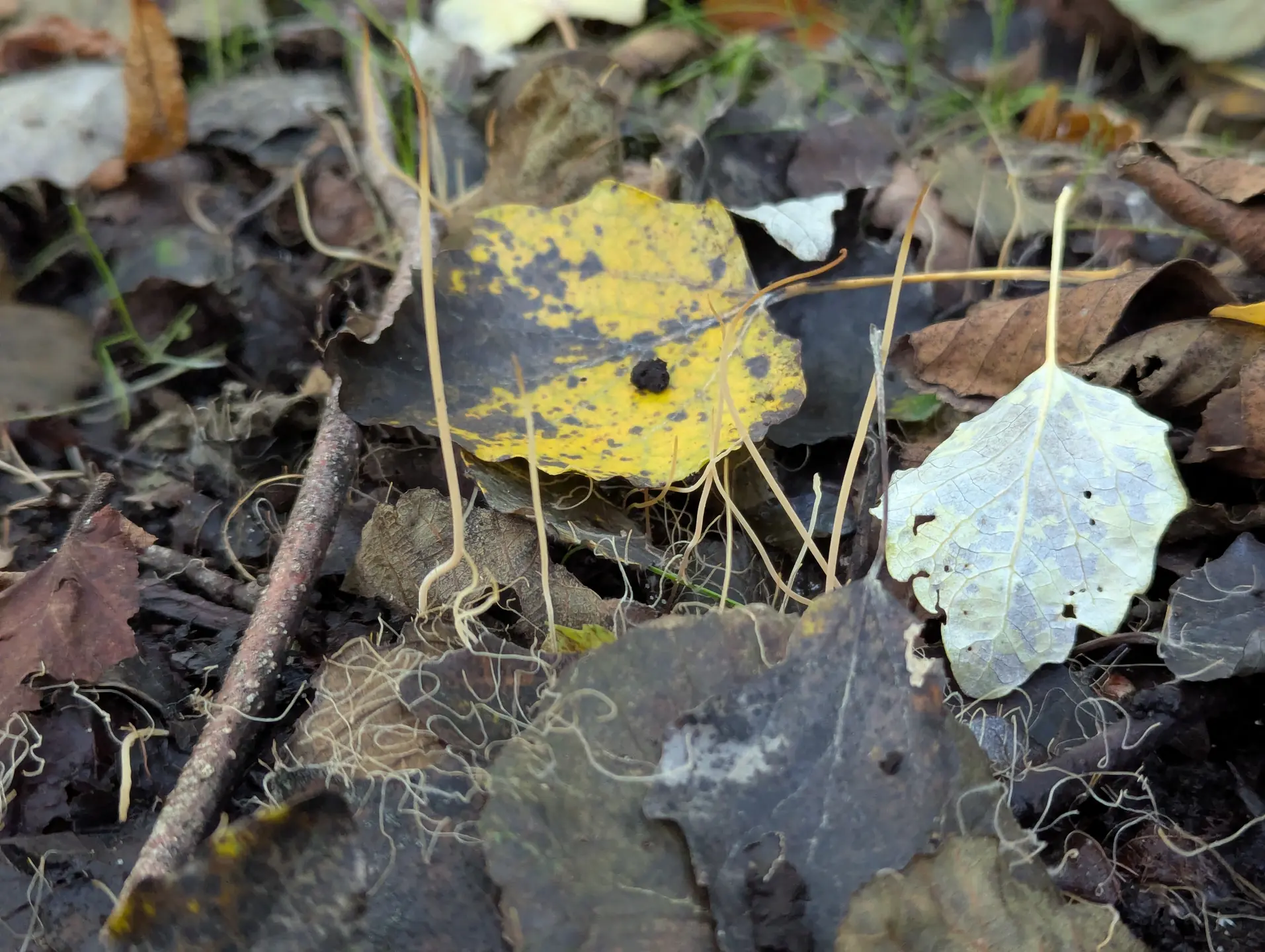 The white clubs were growing among clusters of Macrotyphula juncea (the slender club), whose rhizomorphs were like a dense mass of tangled threads.