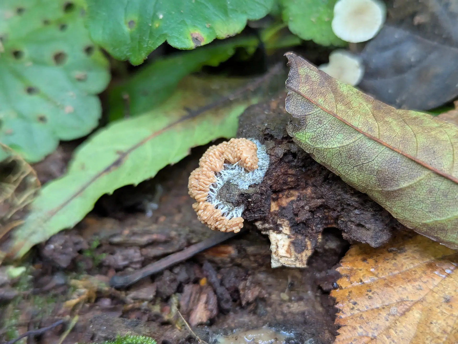 I’m wondering if this is the plasmodium of Lignydum muscorum (formally Fuligo muscorum). If this is a plasmodium – there is some resemblance to some online images of claimed Lignydum muscorum. And in his ID handbook of slime moulds, Ing describes Lignydum muscorum as having an apricot plasmodium.