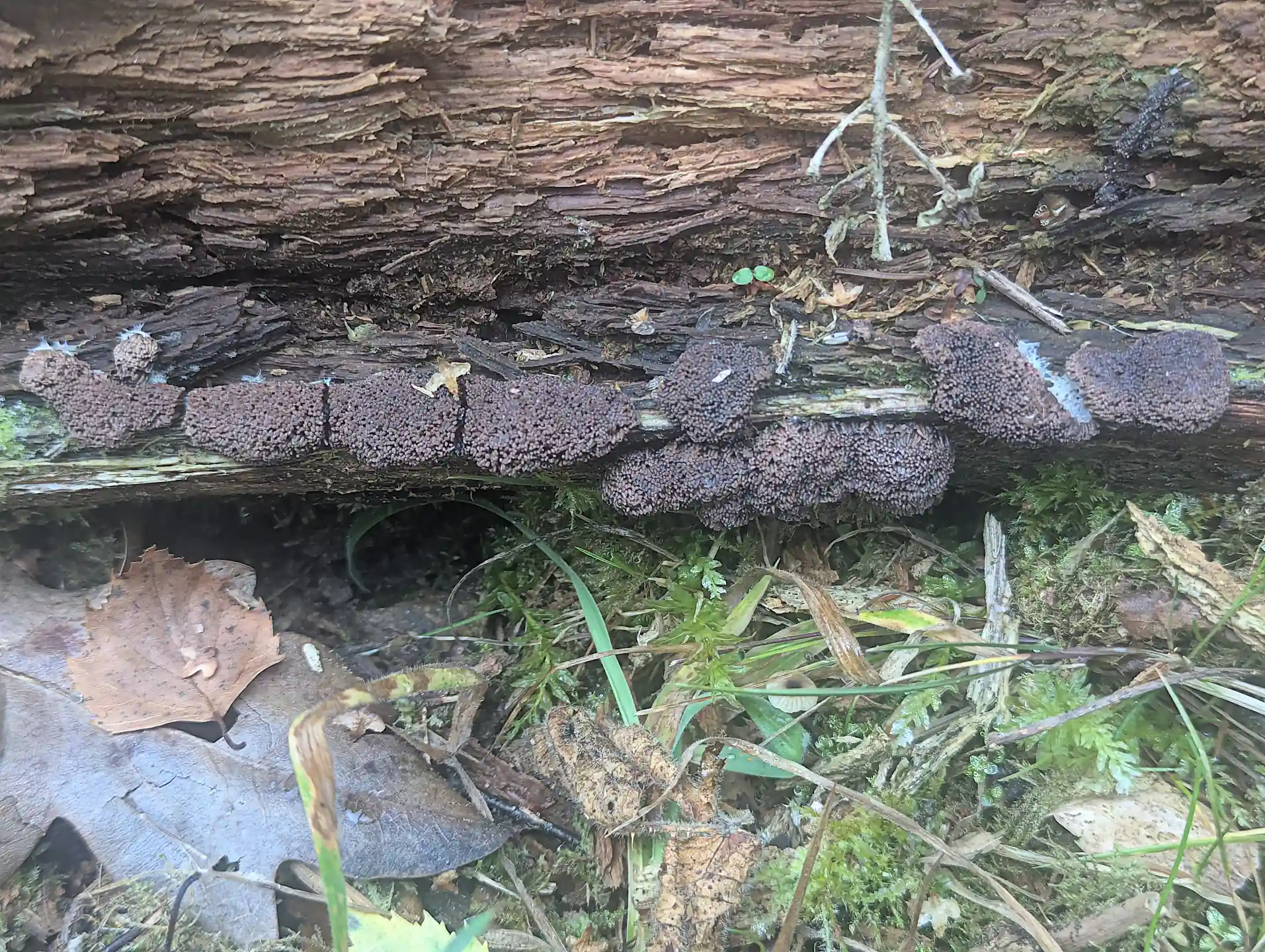 After The Outpost, on the same decaying Birch trunk that we documented the development of Stemonitis flavogenita (Slime moulds & fungi at Strumpshaw Fen June 2024 overview), some mature Tubifera ferruginosa pseudoaethalia.