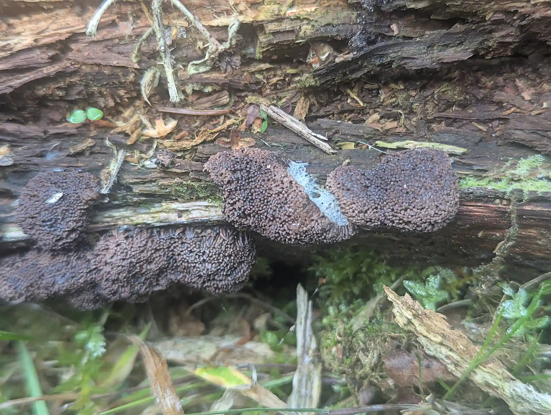 On a broken off fragment of the same trunk some scattered clusters of Ceratiomyxa fruticulosa.