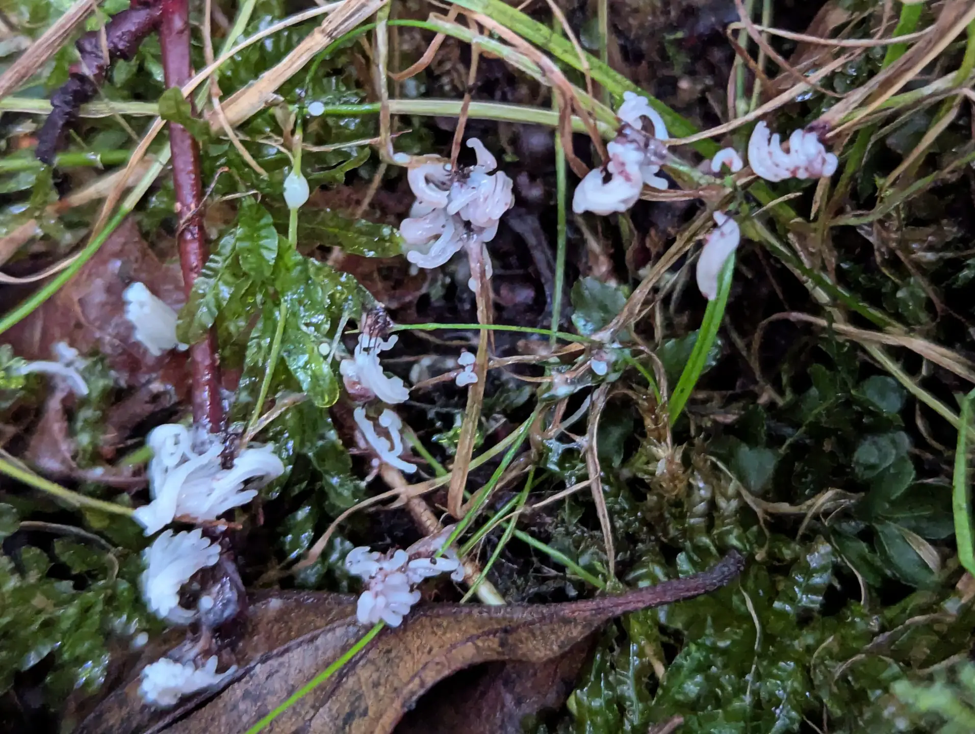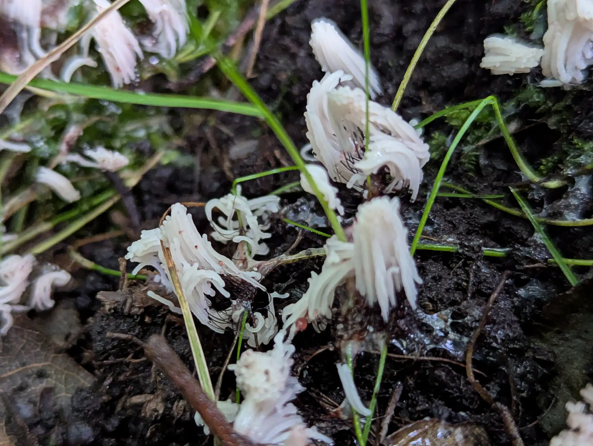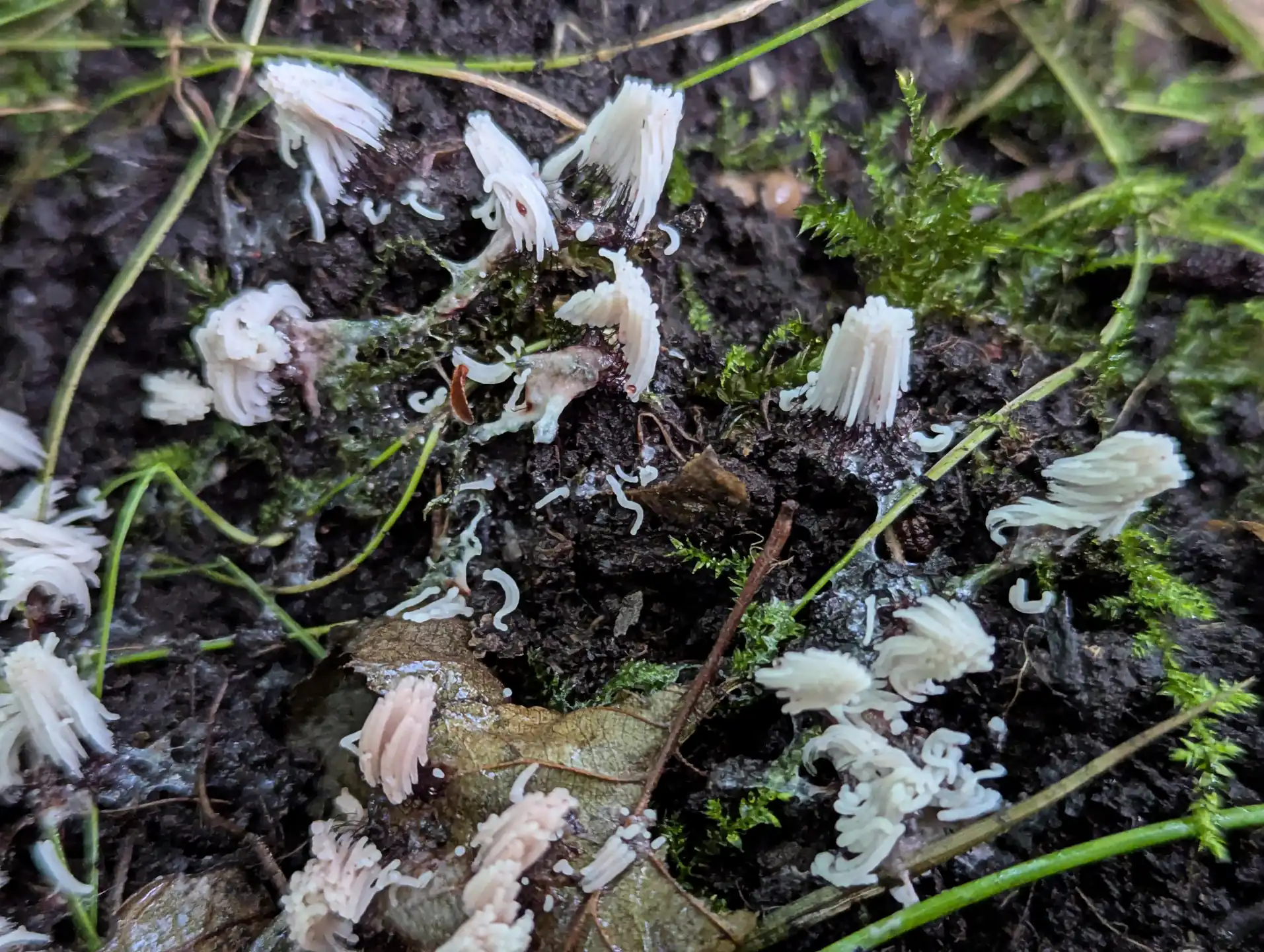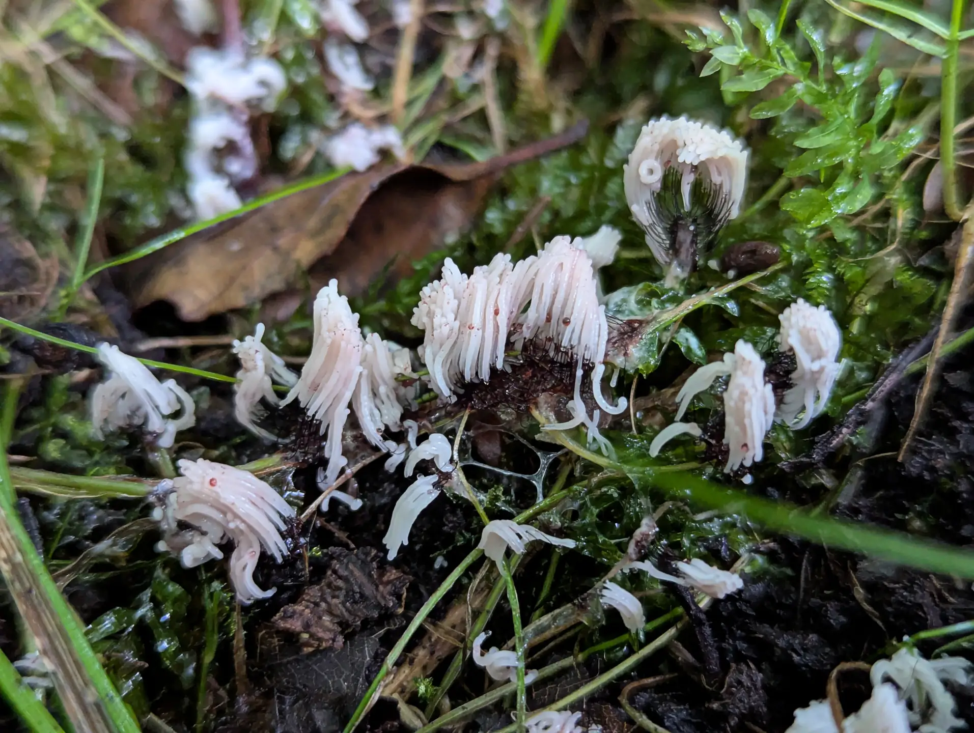Near The Outpost we spotted gregarious groups of light vinaceous grey sporangial capillitial meshes that looked like an Arcyria slime mould. Interspersed were capillitial sporangia of Hemitrichia clavata.