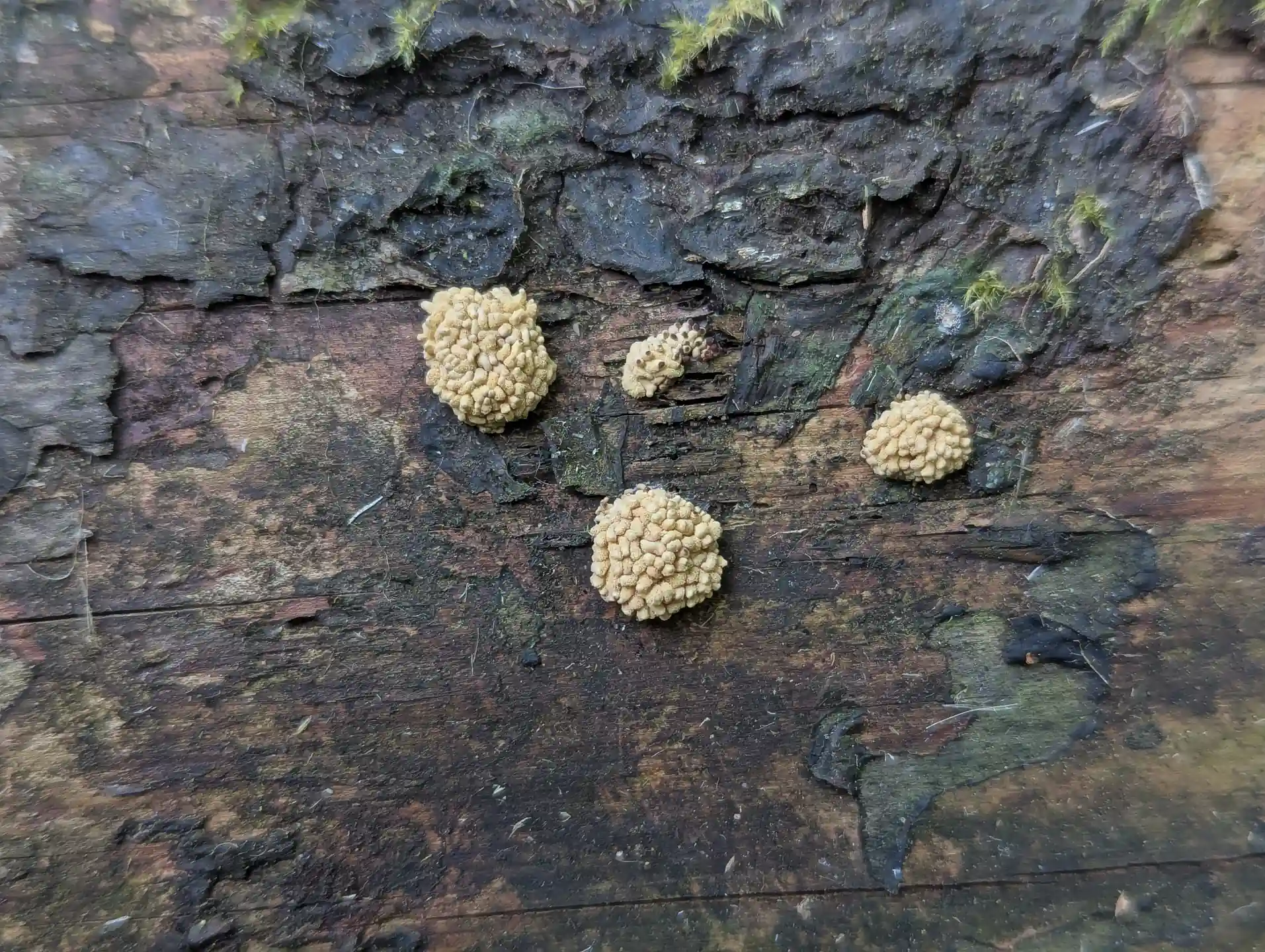On the decaying trunk that we had been keeping an eye on—along the drainage channel path—some lovely Ceratiomyxa fruticulosa slime mould.