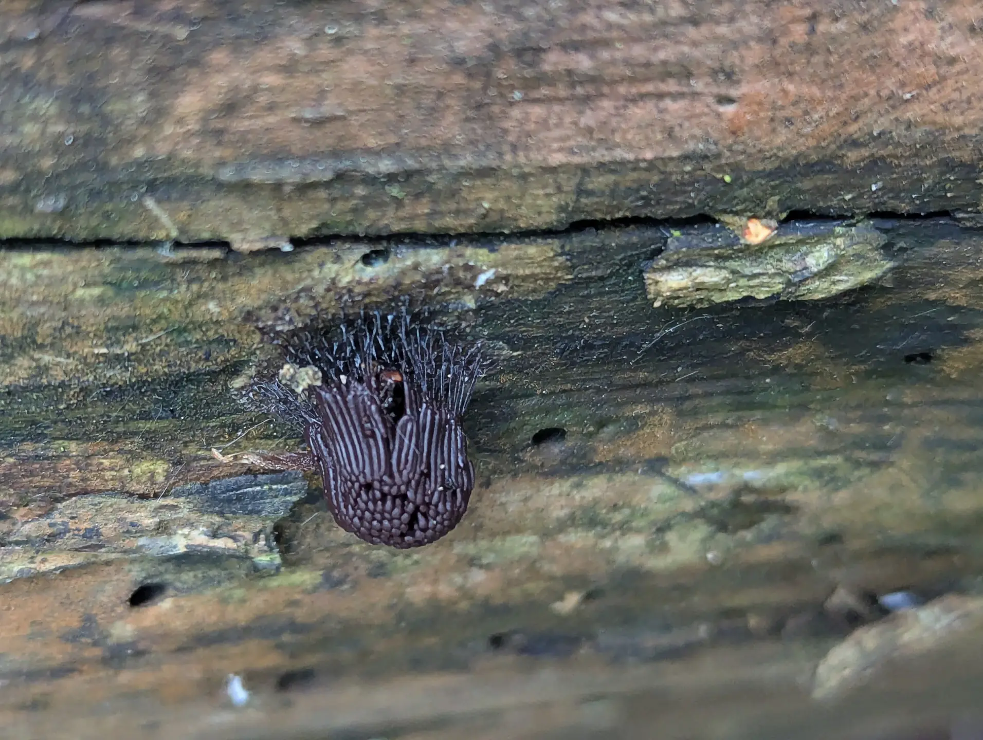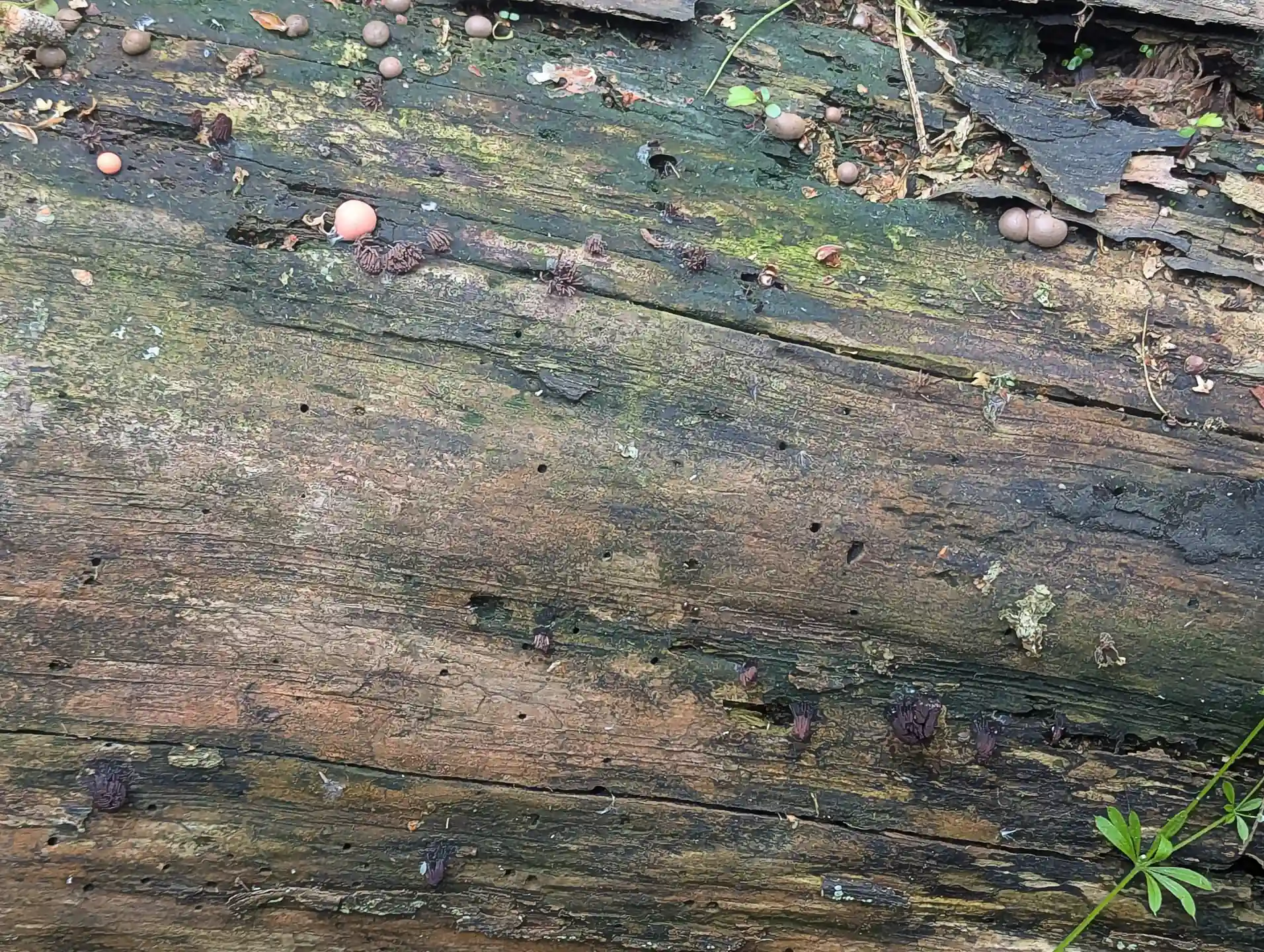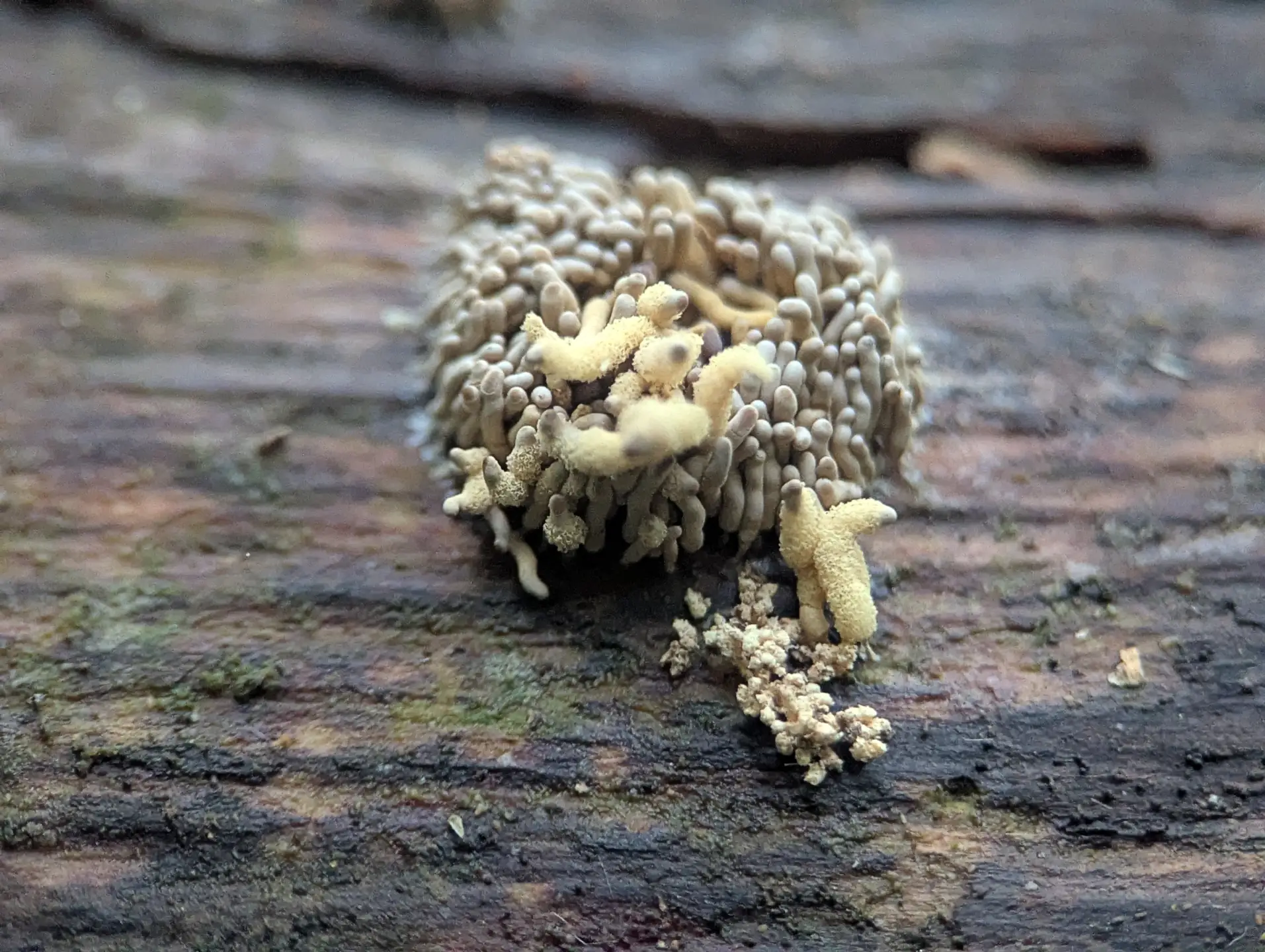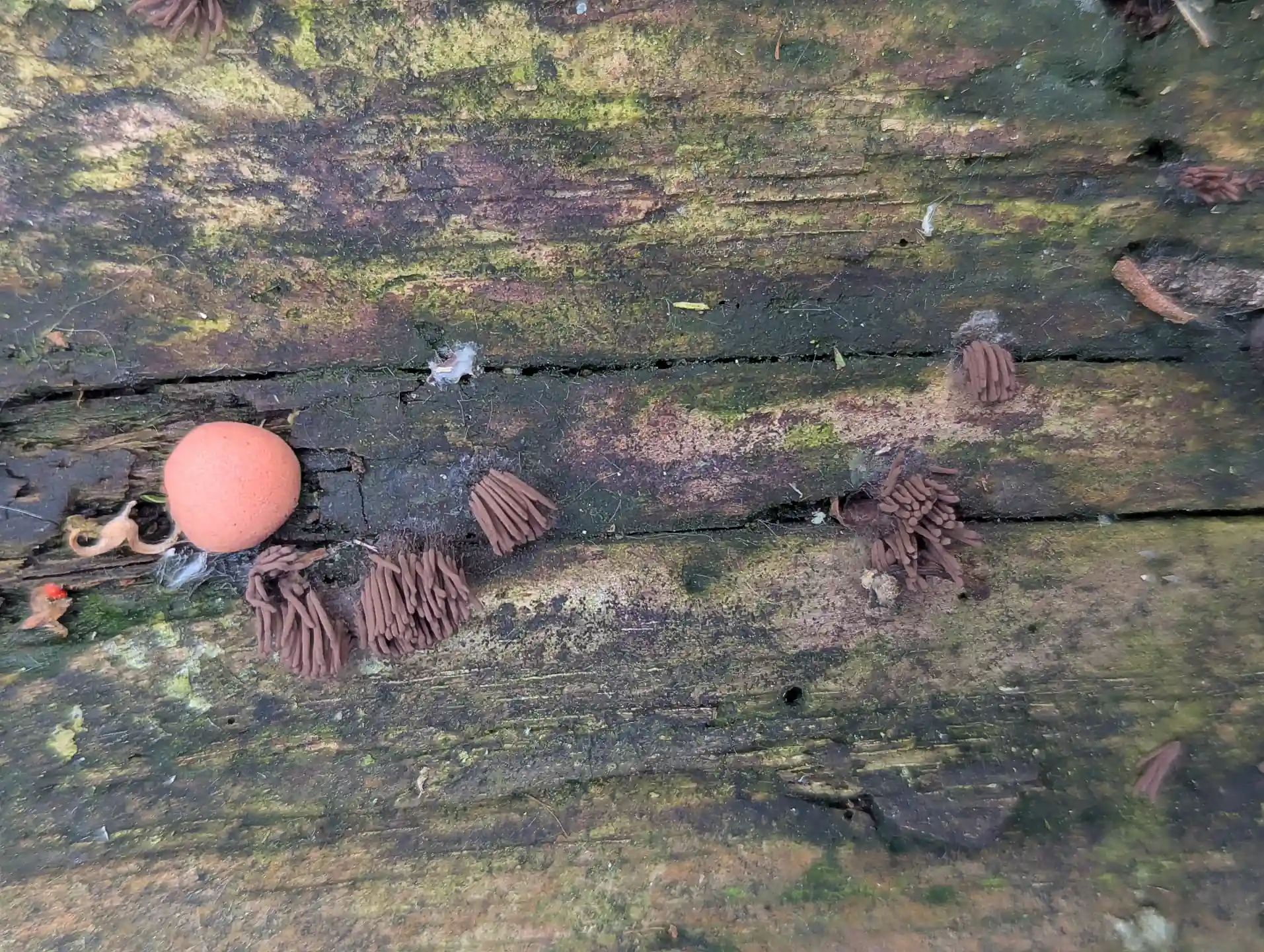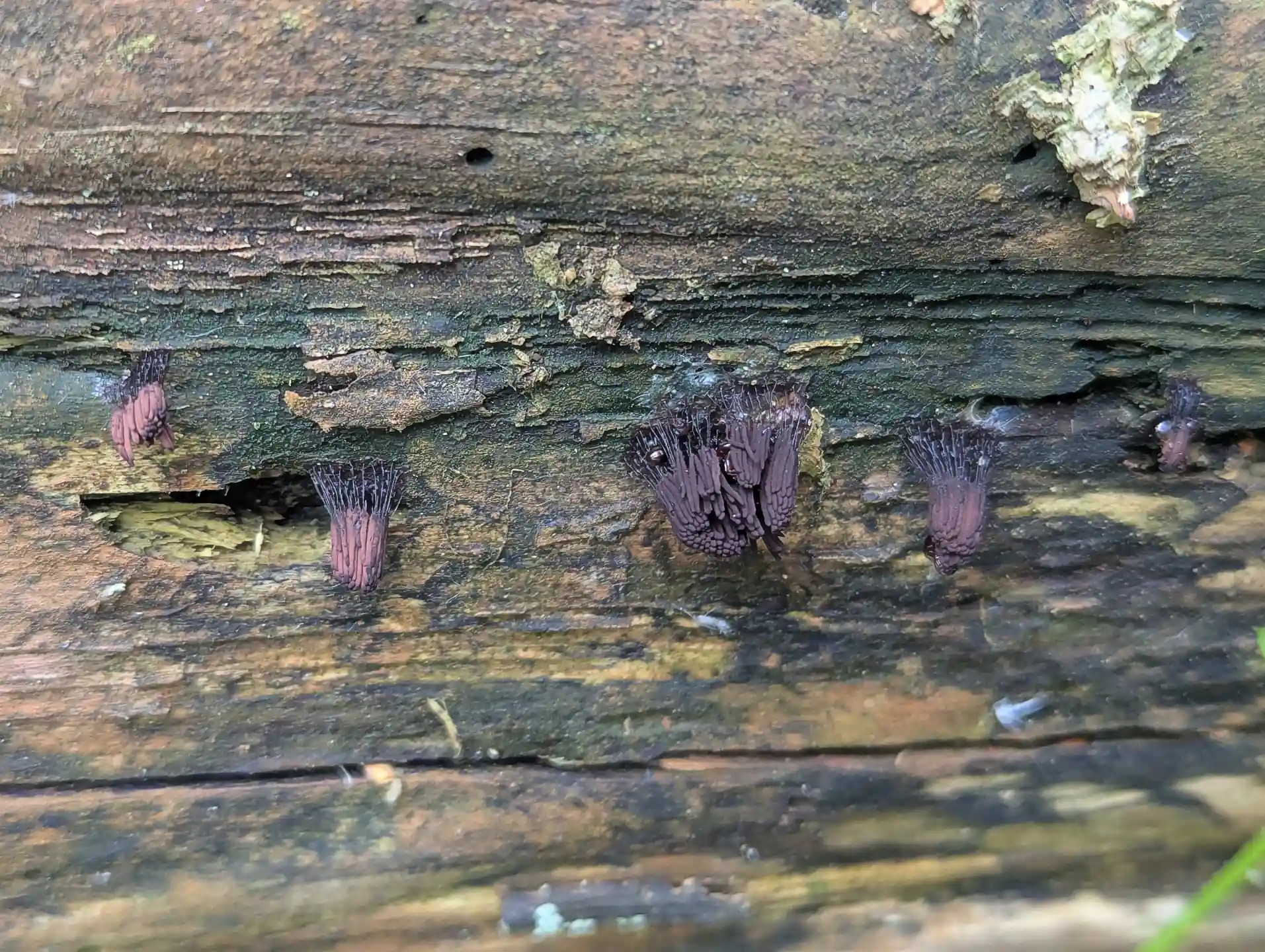 Near The Outpost, on a broken section of the fallen trunk where we saw Stemonitis and Badhamia utricularis, some likely Hemitrichia clavata.