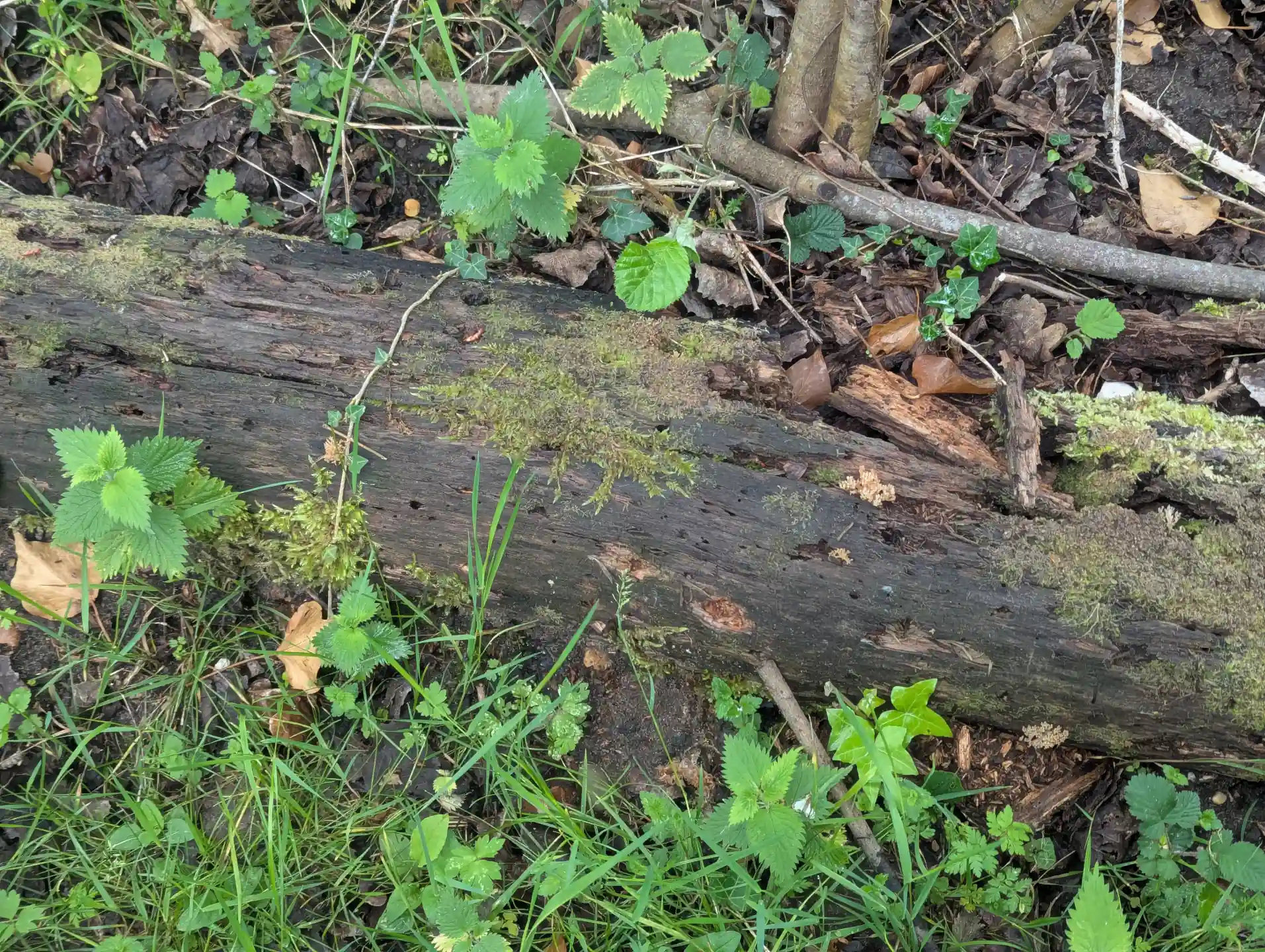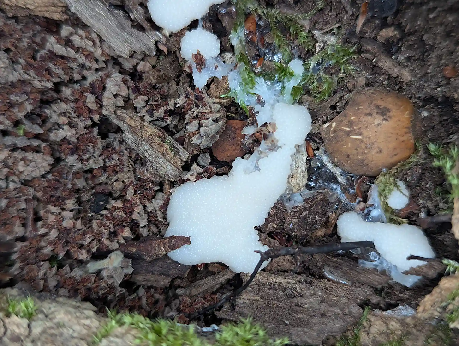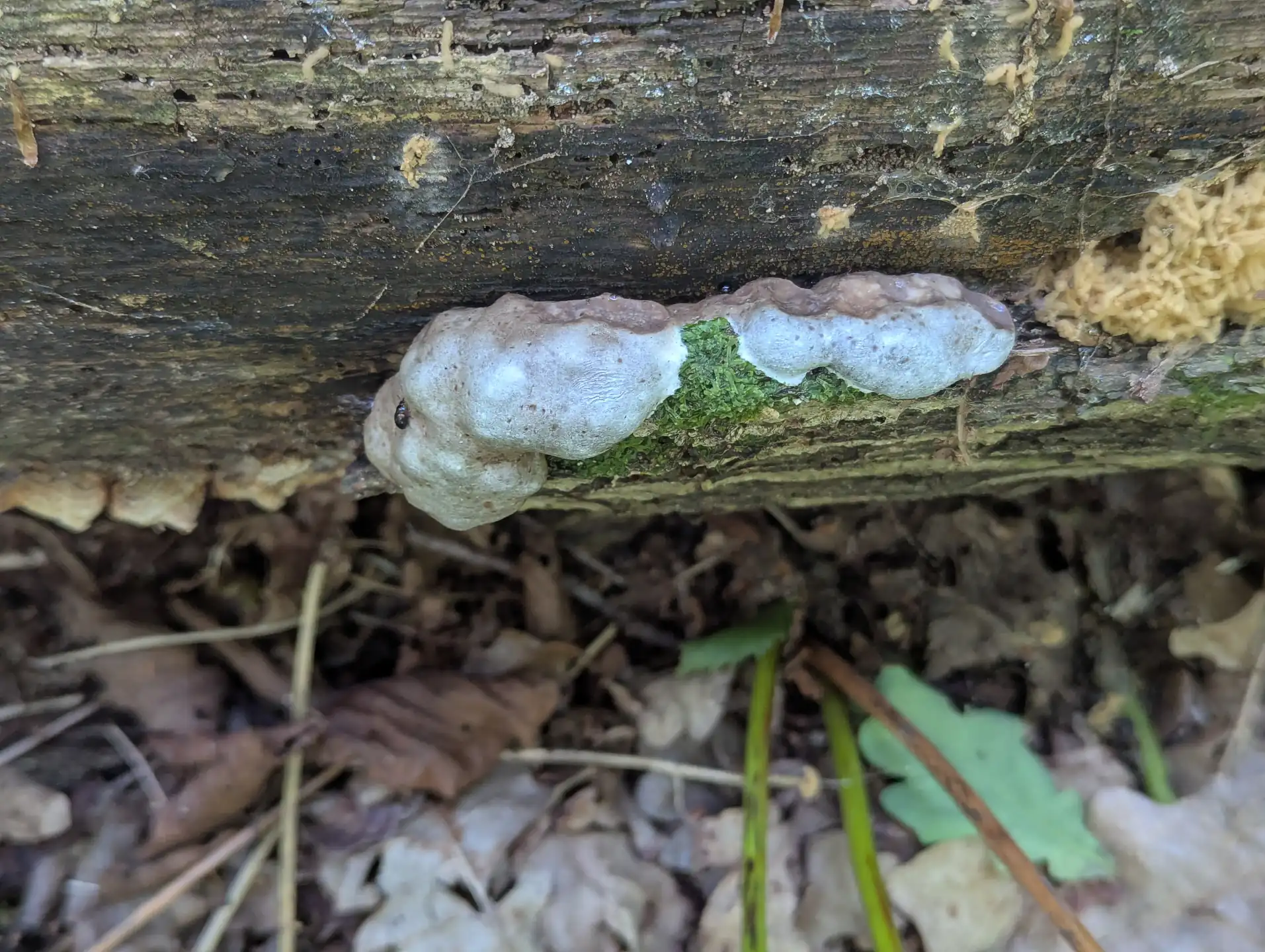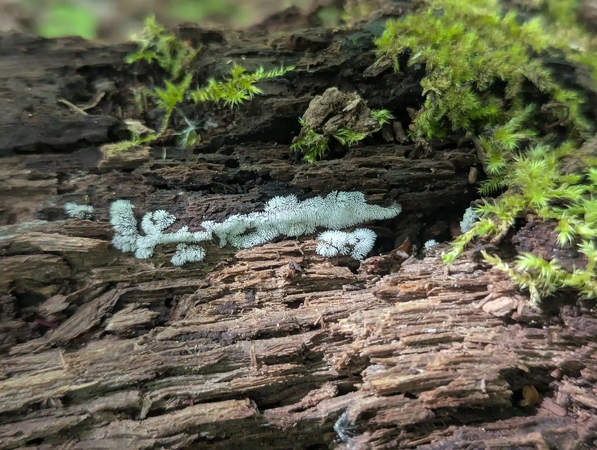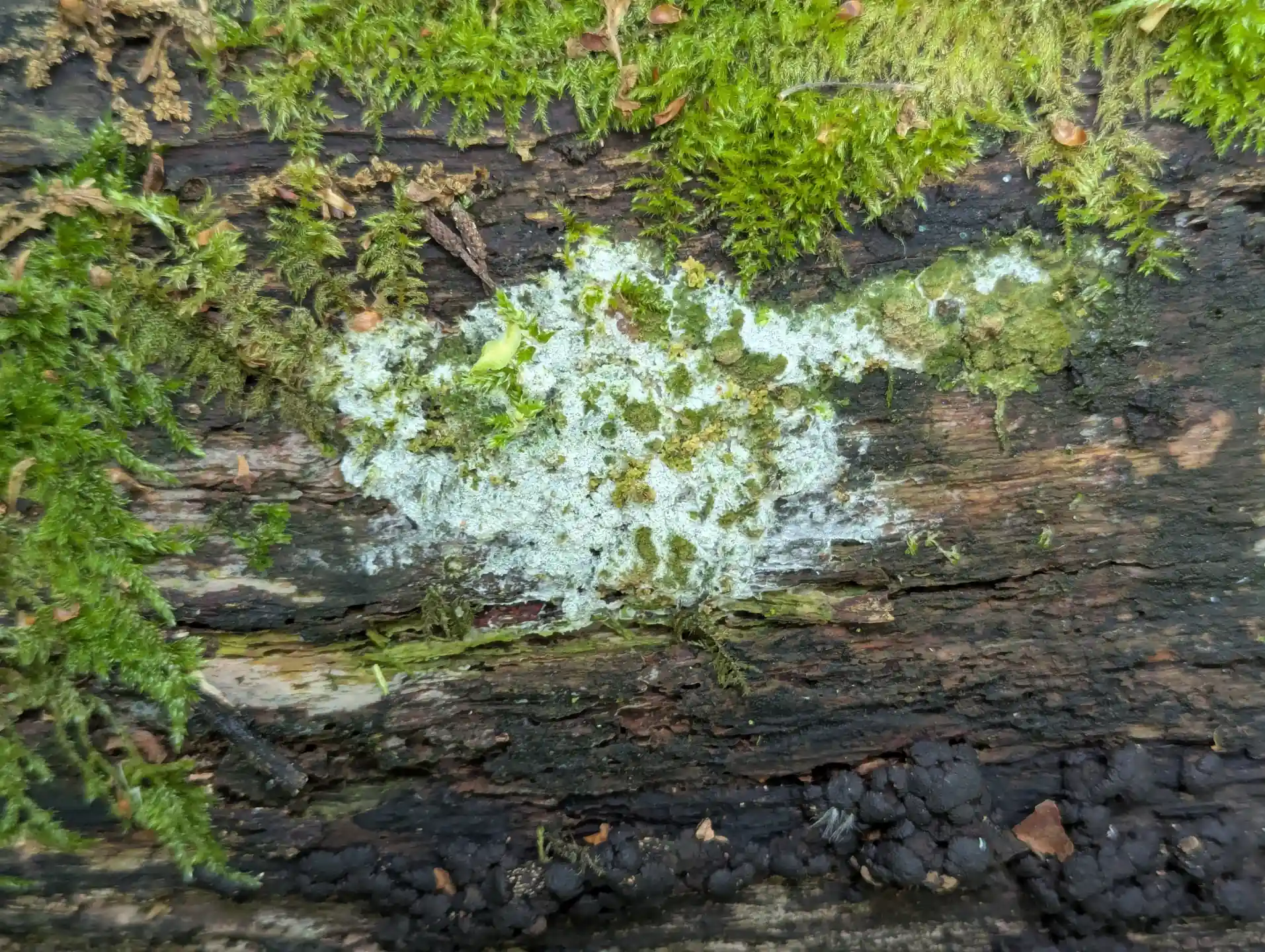 We haven’t seen the slime mould Mucilago crustacea since my daughter’s mycological survey in 2023. After The Outpost we noticed this slime mould spreading through some moss on section of trunk.