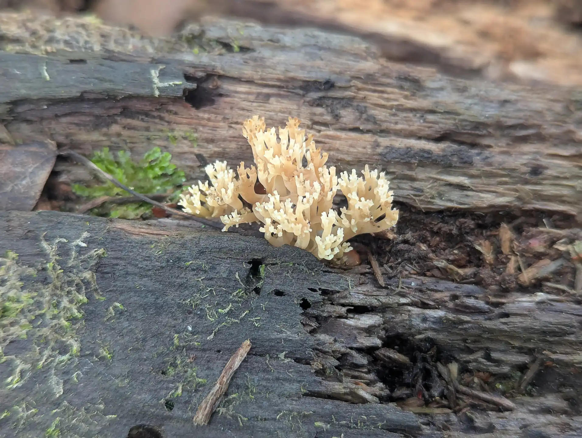 The daughter spotted these Artomyces pyxidatus fruiting bodies on this trunk during her 2023 mycological survey of the reserve woodland.