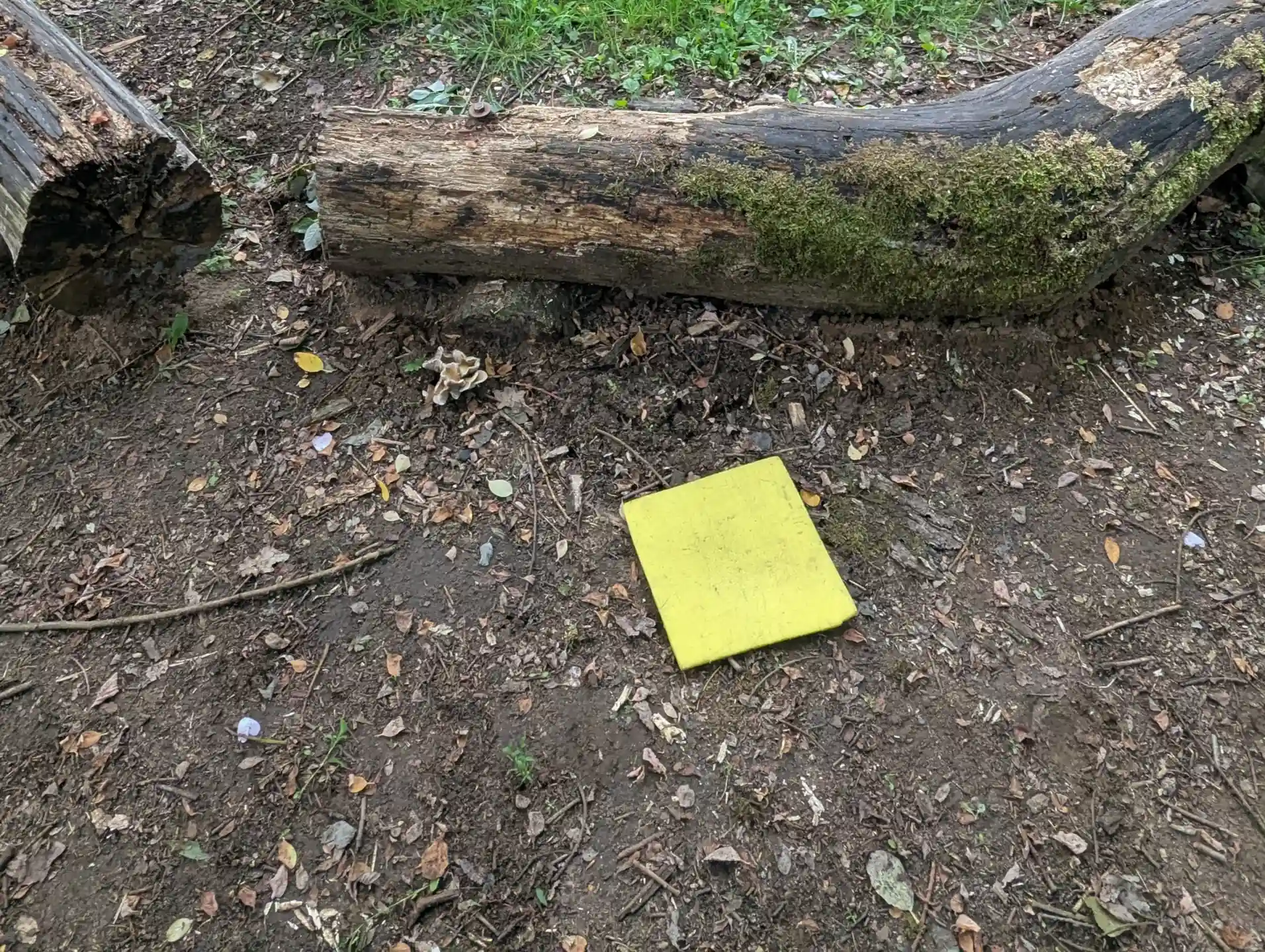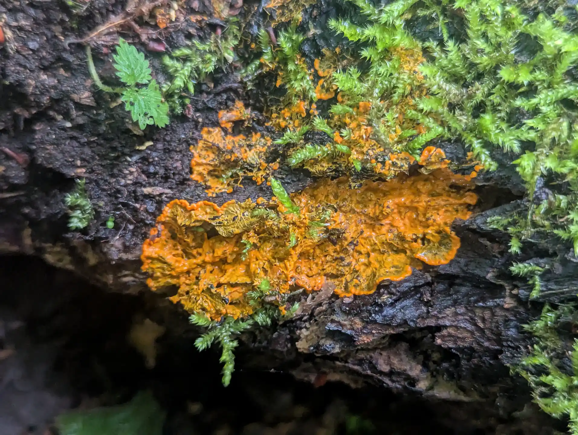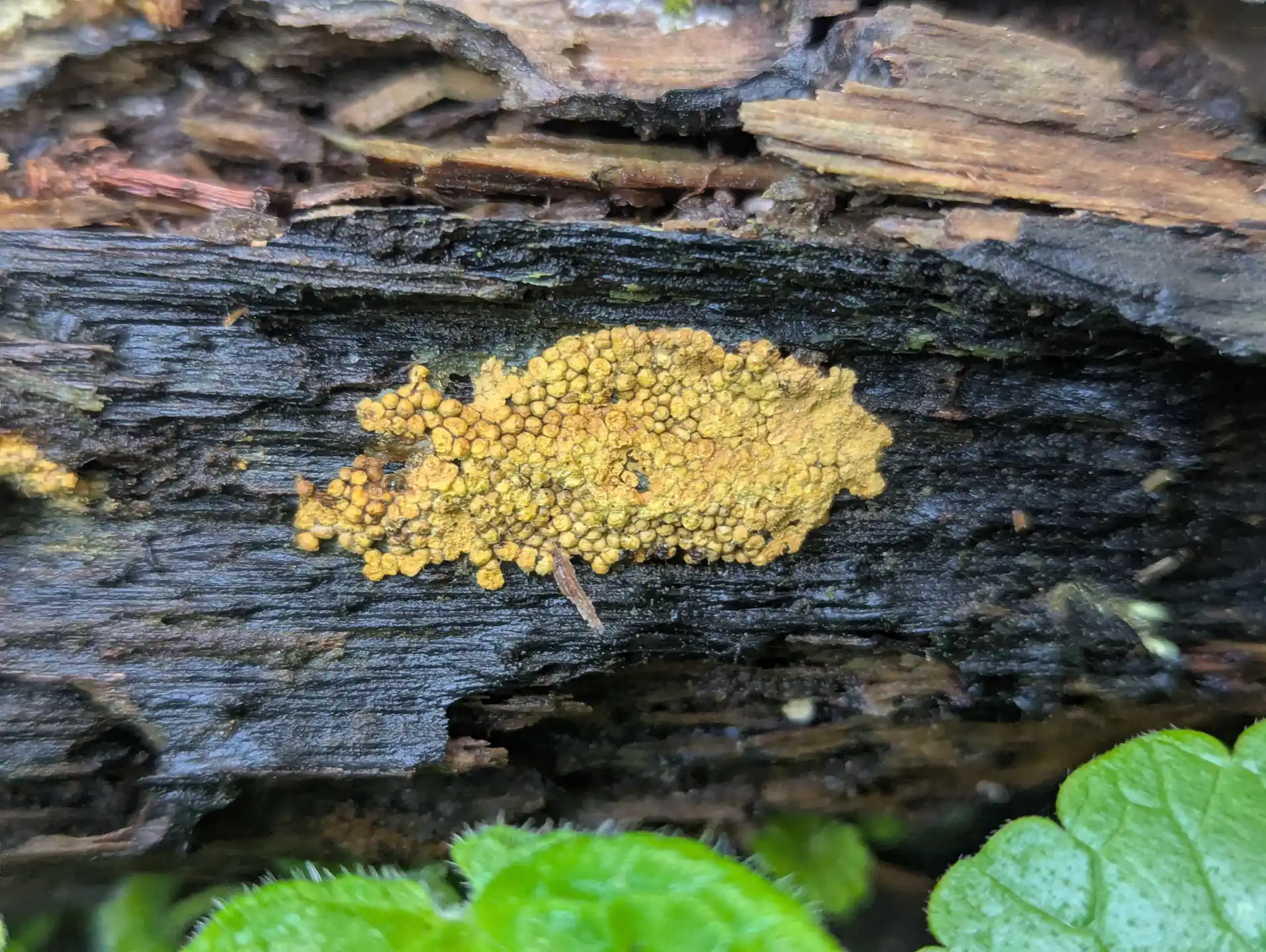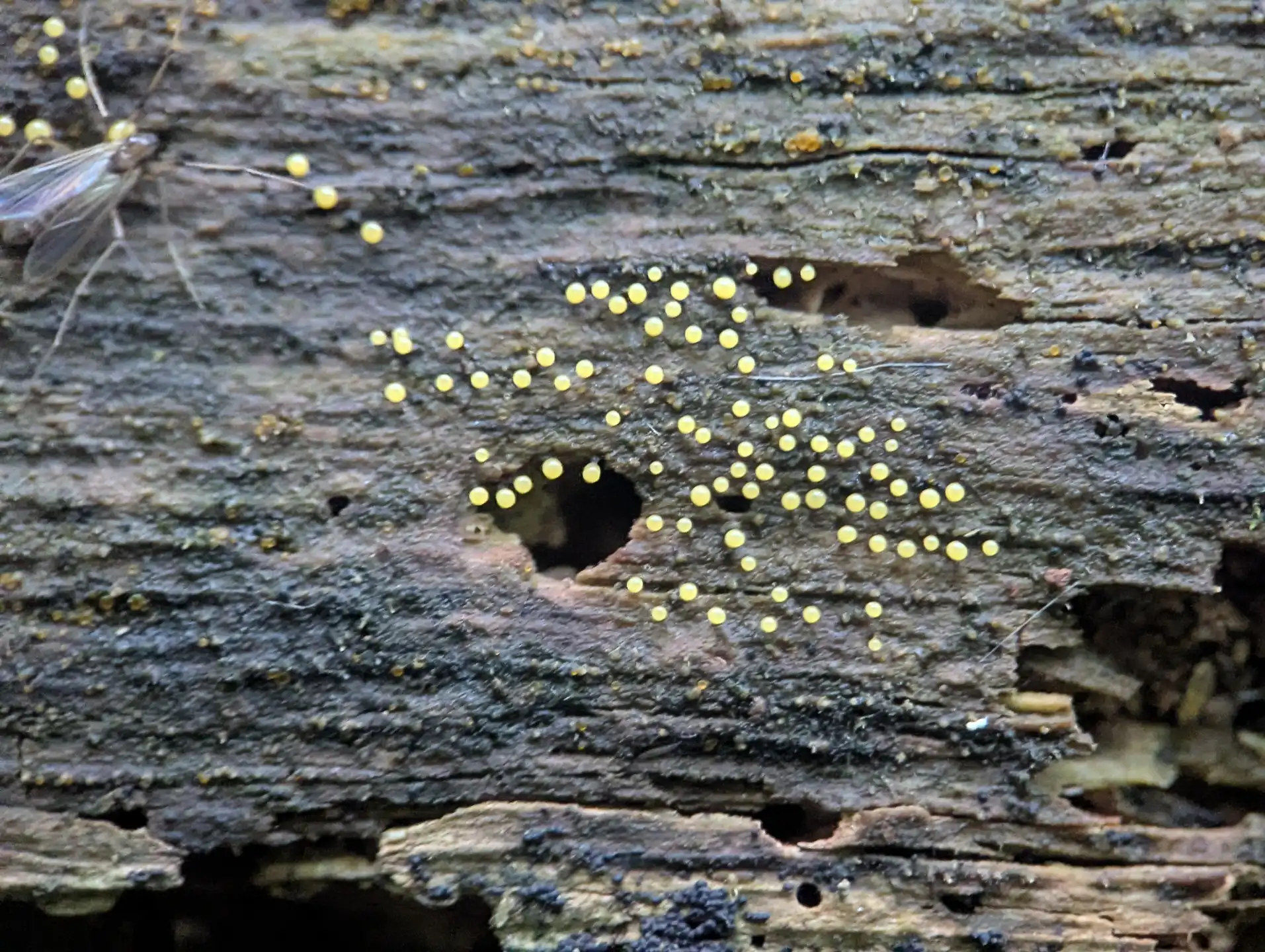 Also on the trunk were some lovely luminescent yellow sporangia that we would later identify as likely Physarum album.