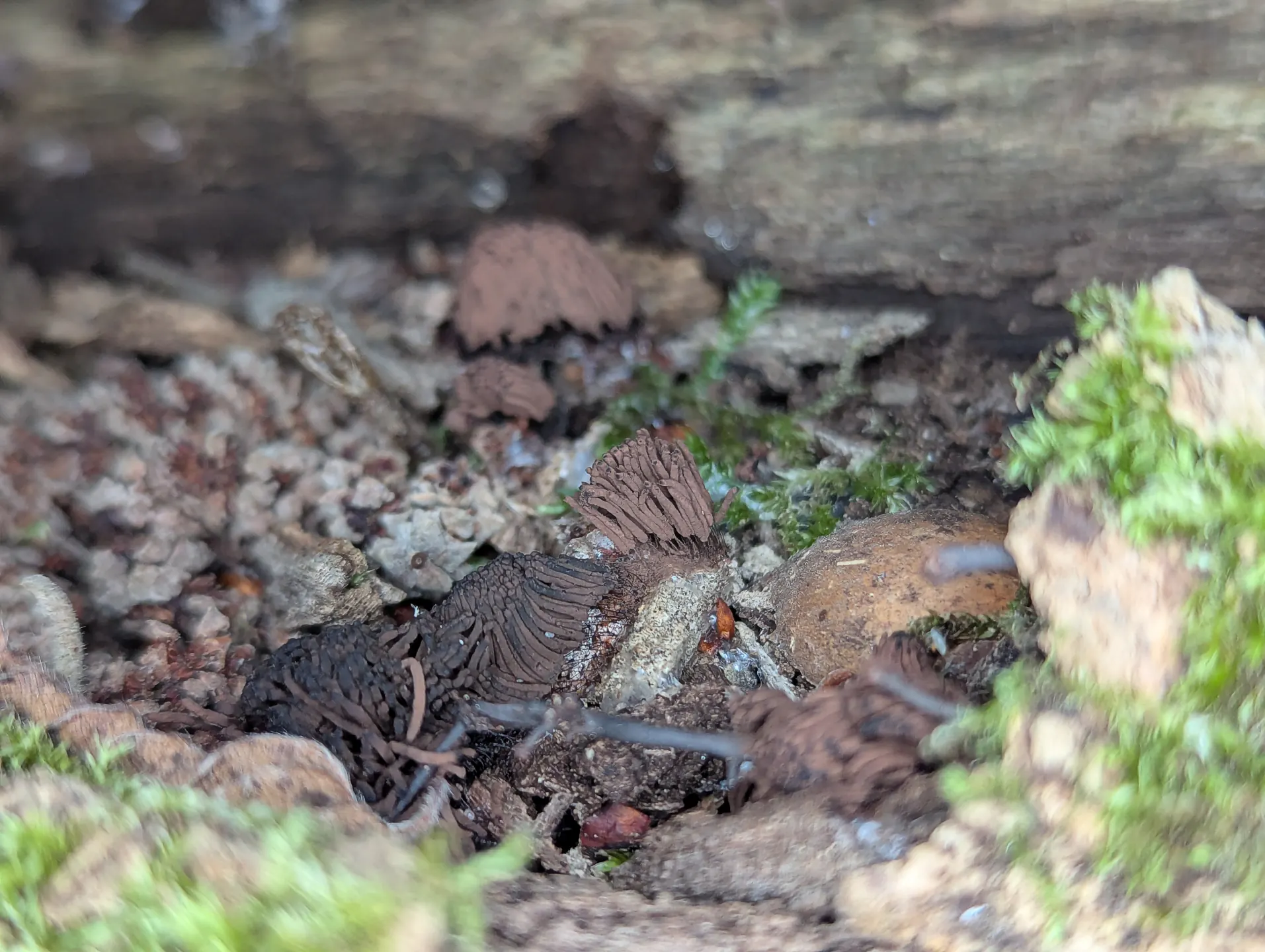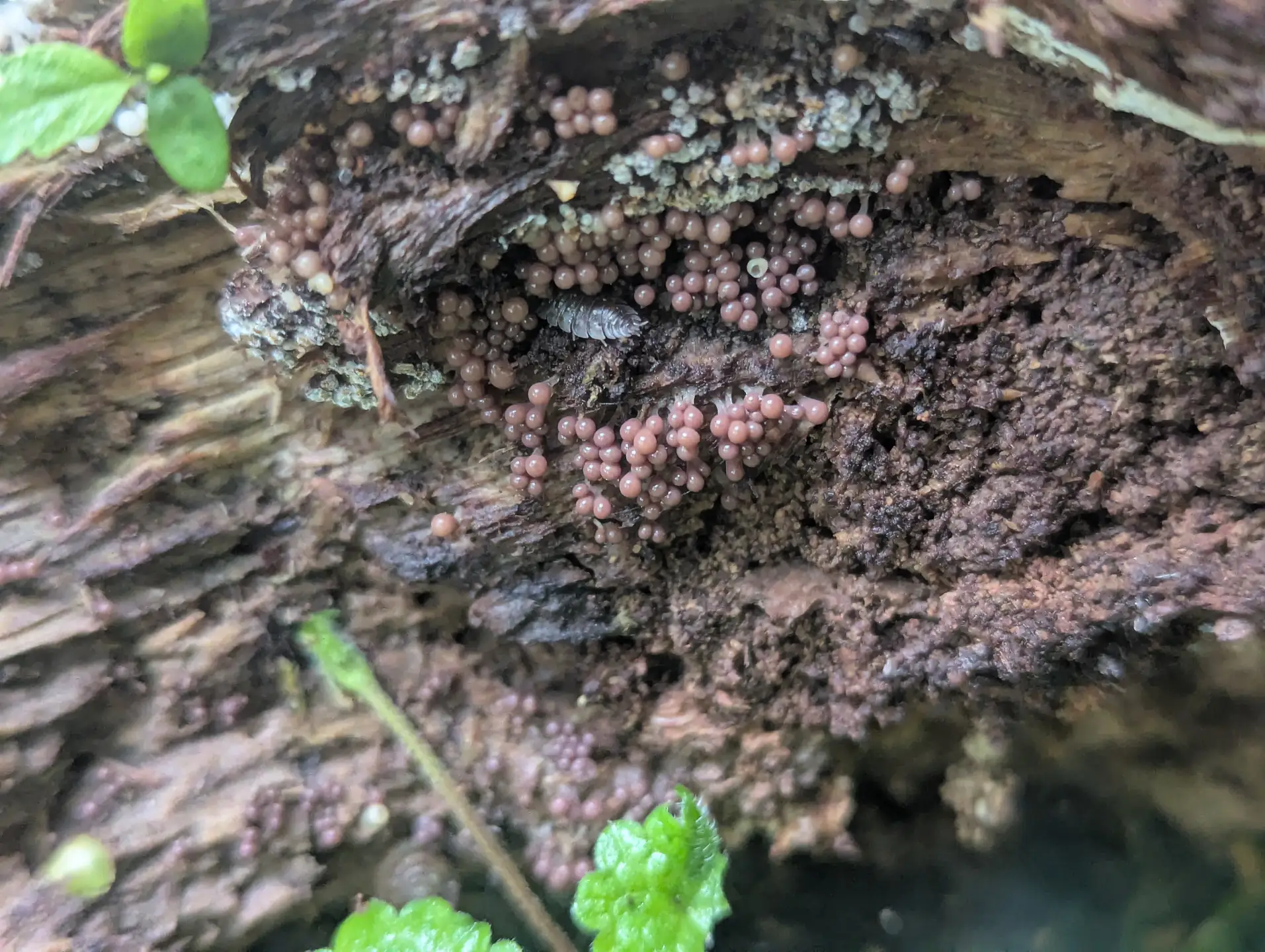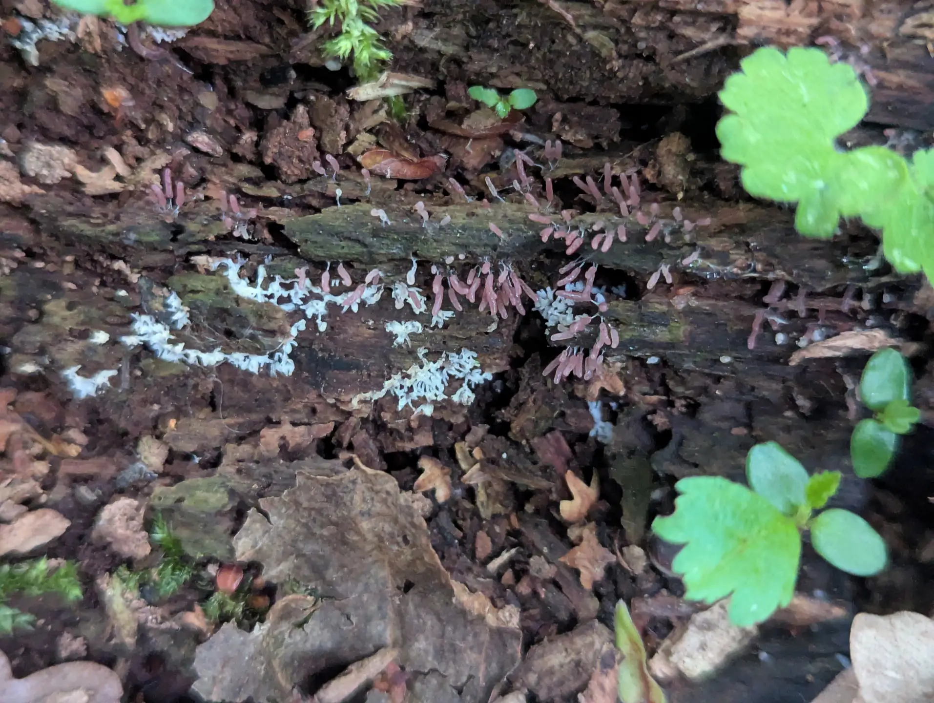 Near The Outpost some translucent, vinaceous Stemonitopsis typhina sporangia and what I think is Ceratiomyxa fruticulosa—although you could be mistaken for thinking it’s early-stage sporangia of the Stemonitopsis typhina.